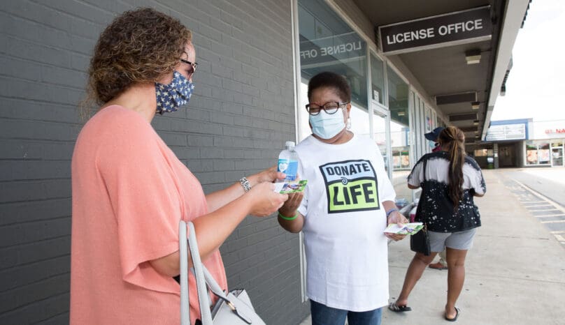 In addition, as DMVs have moved lines outside for social distancing purposes, Mid-America Transplant volunteers have showed up to provide cold water and donation information on hot summer days. The water provides respite as the customer waits, and volunteers take a moment to share their story and encourage guests to considering joining the registry.